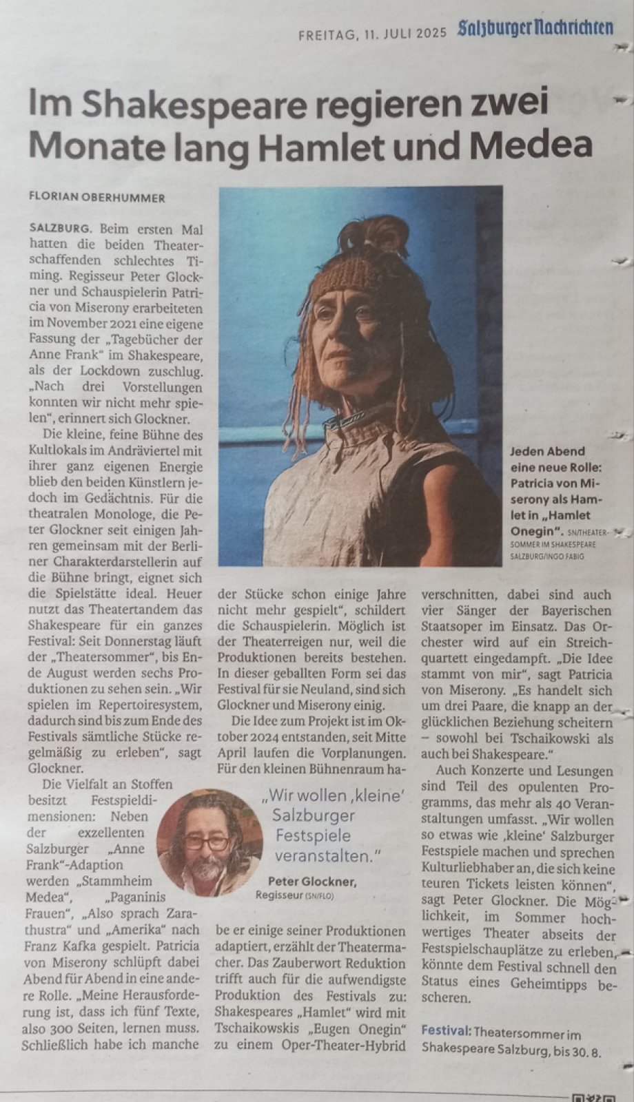 In der freien Salzburger Produktion schlüpft Patricia von Miserony in die Rolle der Anne Frank. Die Besetzung der Jugendlichen mit einer reifen Charakterdarstellerin erweist sich, wie ein SN-Besuch der Generalprobe offenbart, als Coup. Denn wie sich die Berliner Schauspielerin die Sprache anverwandelt, mit ihr spielt und vielschichtige Bedeutungsebenen und Färbungen verleiht, das erlebt man in Salzburg außerhalb der Festspielzeit selten. Patricia von Miserony fördert die literarische Qualität dieser erstaunlichen Frühbegabung, die ja Journalistin werden will, zutage. Denn die Betrachtungen über globale Ernährungsprobleme, über hoffnungsvolle Vorstöße der Alliierten und nicht zuletzt über den Tod sind verblüffend weitsichtig. Gleichzeitig gelingt es ihr, den jugendlichen Überschwang, erste Liebesgefühle und die "ungekühlte Wut" einer 13-Jährigen so authentisch dazustellen, als verjünge sie auf der Bühne um 50 Jahre.